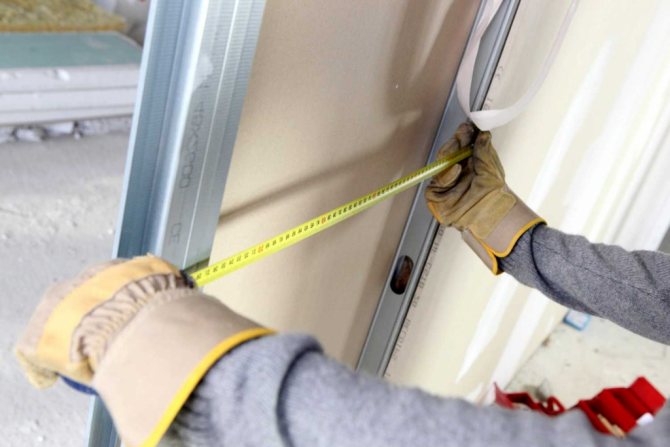 Premièrement, 100 ou 150 mm sont mesurés à partir du sol et du plafond. Des profils horizontaux sont installés sur ces marques, en veillant à vérifier l'exactitude des lignes. Avec un pas de 500 mm, des éléments de revêtement verticaux y sont fixés.