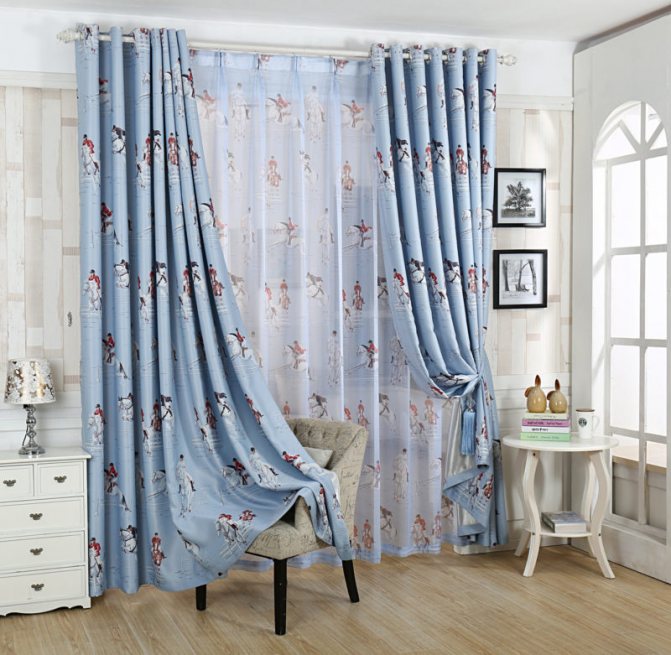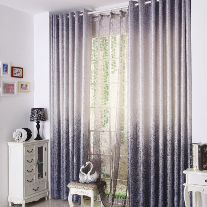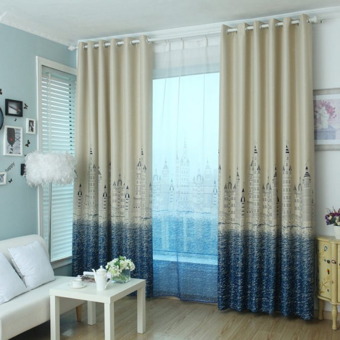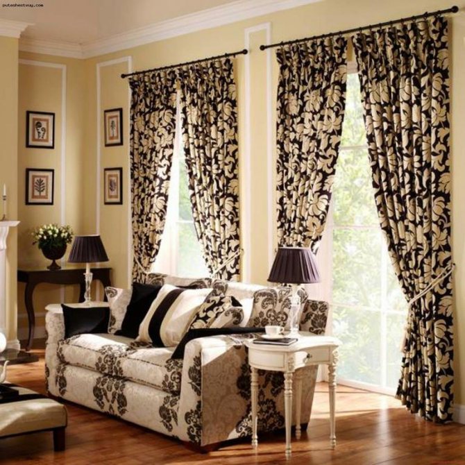 Une excellente option pour un salon, dont les murs sont réalisés dans une version monochromatique, sera des rideaux avec une impression
