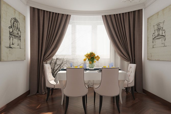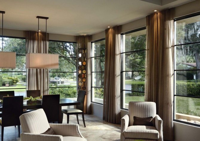 Les grandes fenêtres panoramiques sont très populaires à notre époque, mais les hôtesses de ces locaux sont souvent confrontées au problème de la création de confort dans les chambres, auquel cas les rideaux seront une excellente option.