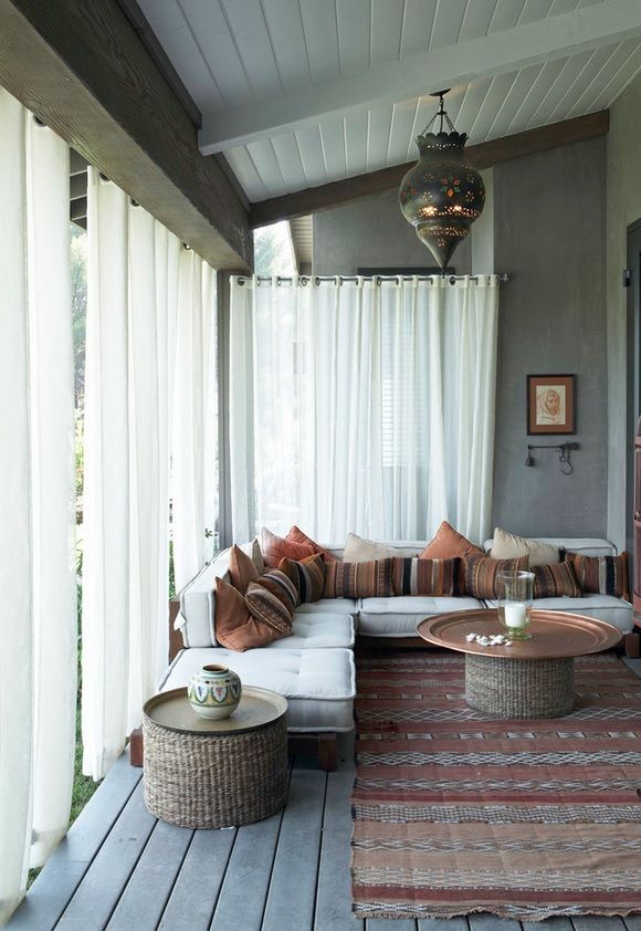 Une véranda avec des ouvertures ouvertes pour organiser une célébration ou recevoir des invités peut être décorée de riches rideaux décoratifs avec des draperies des tissus les plus légers.