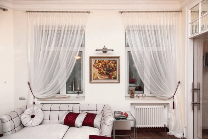 C'est cette circonstance qui nécessite le respect de la première règle: les fenêtres doivent être décorées à l'identique, sinon le décor provoquera une dissonance. Nous ne parlons pas seulement du matériau des rideaux, mais également de la façon dont ils sont fixés, de la longueur et de la largeur des rideaux.