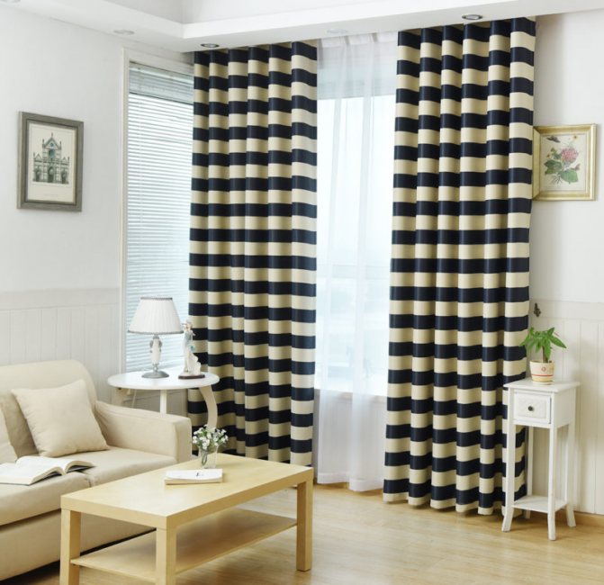 Les stores enrouleurs avec un mécanisme de levage peuvent être avec des bandes horizontales. Dans le même temps, gardez à l'esprit que les tons profonds rétrécissent la toile et les couleurs pastel l'élargissent.