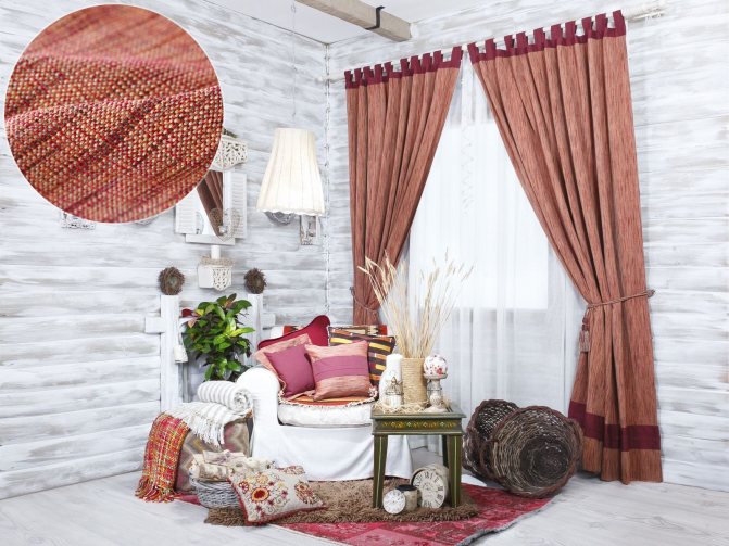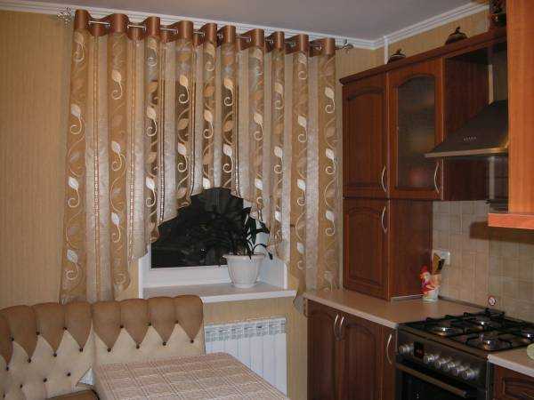 Les rideaux coulissants sur des charnières en tissu de lin avec l'ajout de lavsan ou de viscose peuvent être considérés comme une option idéale pour la cuisine. Les boucles de couleurs vives et contrastées de la même texture avec des rideaux semblent intéressantes.