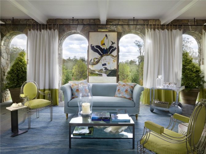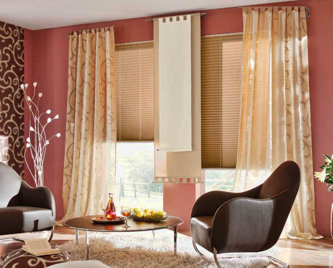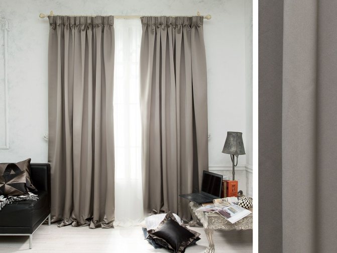 Les rideaux sur charnières en tissus translucides ont ici un aspect original. Dans un salon classique, vous pouvez utiliser un modèle de rideau avec un léger affaissement du tissu entre les boucles. Ainsi, des plis volumétriques se forment. Pour cela, des tissus denses et lourds sont choisis.