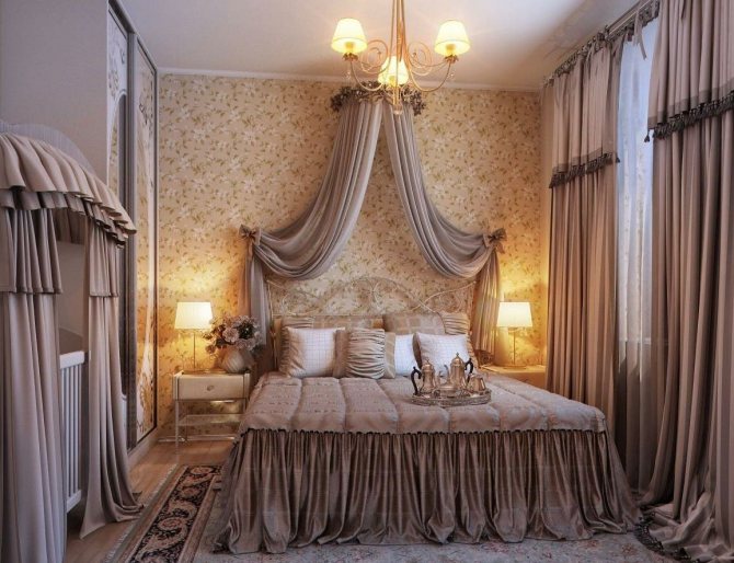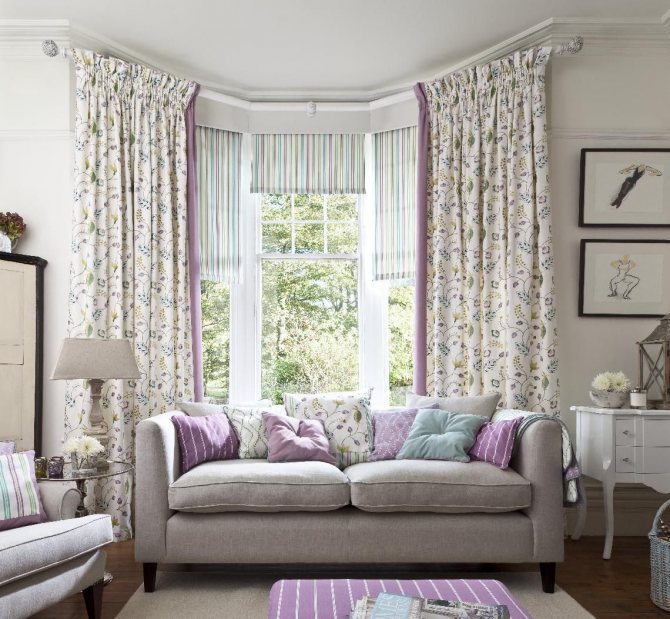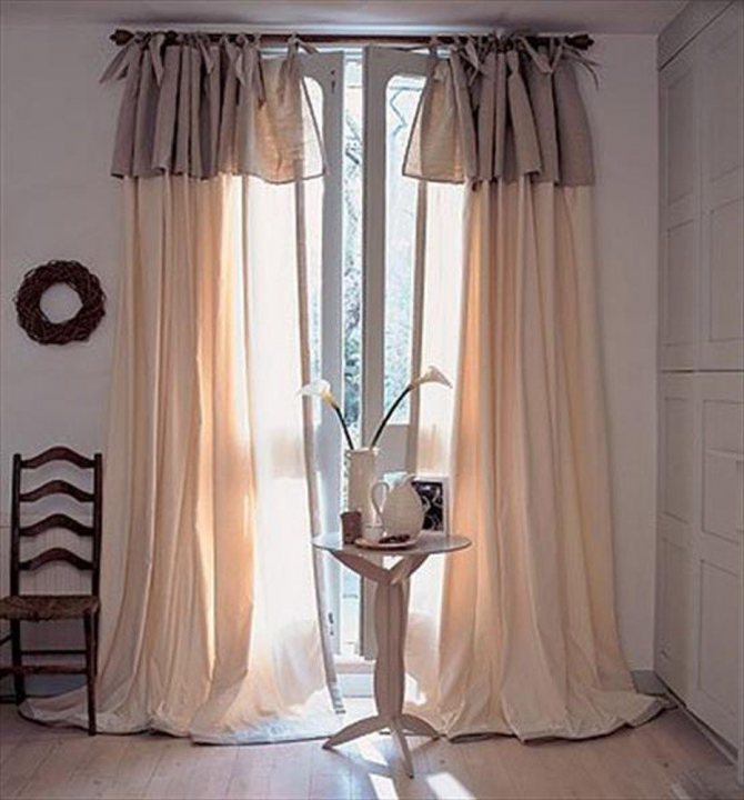 Pour protéger la pièce des rayons du soleil, les rideaux sur les charnières sont complétés par des rideaux denses ou un lambrequin d'un seul design. Les boucles ont l'air intéressantes, en outre décorées de rubans, de perles, de nœuds. Pour éviter que le tissu ne s'affaisse et qu'il n'y ait pas d'espace de lumière, un ruban de rideau spécial est utilisé.
