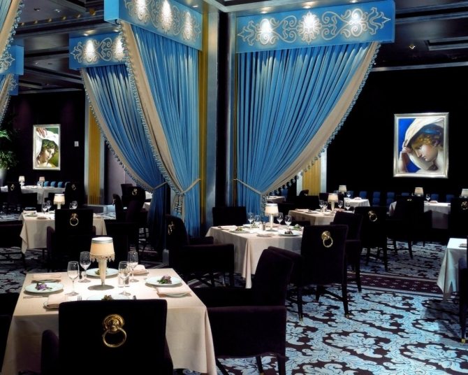 - Restaurants et salles de banquet - utiliser des modèles à lambrequins rigides sur charnières, garnis et décorés de perles, de volants, de volants. D'autres trouveront leur place ici: des rideaux italiens, en organza, en voile, dans un style high-tech et minimalisme.