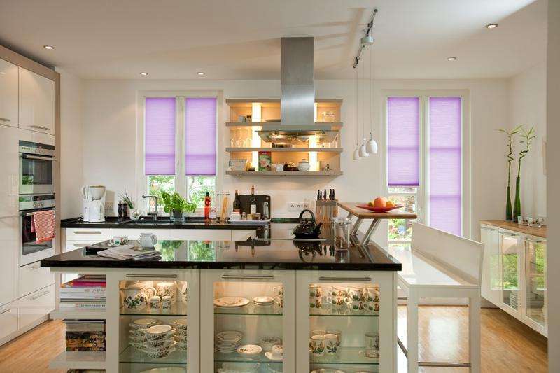 Particulièrement pratiques pour la cuisine sont extensibles "plissé double" avec réglage simultané des positions supérieure et inférieure ou "Jour-nuit", fixés sur les portes. Les stores plissés sur les fenêtres en plastique de la photo, qui sont présentés ci-dessus, économisent de l'espace et laissent le rebord de la fenêtre complètement libre.
