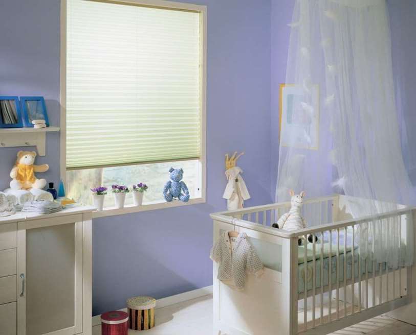 Il n'y a pas besoin d'obscurité totale dans la chambre du nouveau-né. Un rideau plissé compact, diffusant doucement la lumière, en tissu de rideau translucide convient ici. Il remplacera parfaitement le tulle classique et, contrairement à lui, n'accumulera pas de poussière à sa surface.
