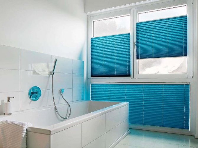 Dans la salle de bain, ce décor a l'air plus que approprié.Naturellement, étant donné le taux d'humidité élevé de cette pièce, vous devez choisir des modèles avec une imprégnation résistante à l'humidité et les stores en papier plissé ne fonctionneront pas ici.
