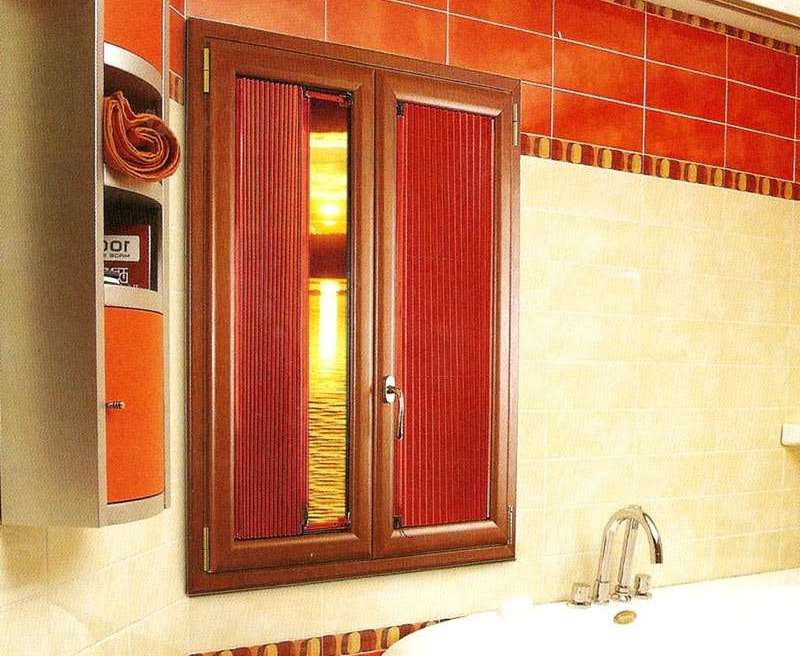 Avec des toiles accordéon dans la salle de bain, vous pouvez décorer non seulement la fenêtre, mais aussi la niche en dessous. Dans un tel créneau, il sera pratique de stocker toutes sortes de fournitures ménagères et de produits chimiques ménagers.