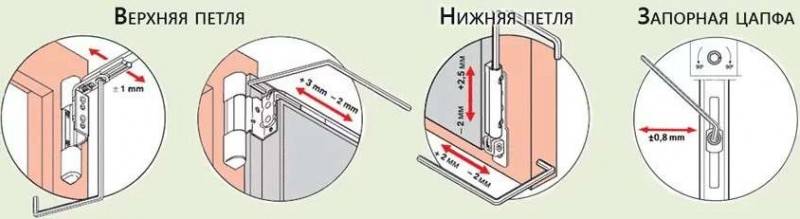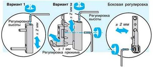 Lorsque la vis latérale est tournée avec la clé, l'ouvrant s'éloigne du cadre ou, au contraire, appuie contre celui-ci. En tournant les vis latérales, l'affaissement de la porte du balcon peut être complètement éliminé. Avec leur aide, la ceinture est déplacée dans une certaine direction.