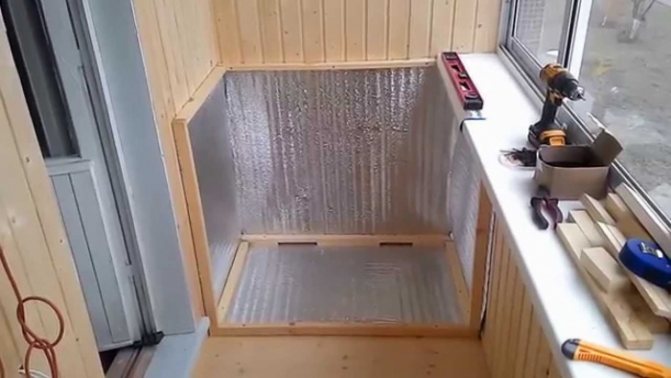 Après cela, les murs et le sol du balcon sont isolés avec du polyéthylène recouvert d'une feuille et un film infrarouge est installé.