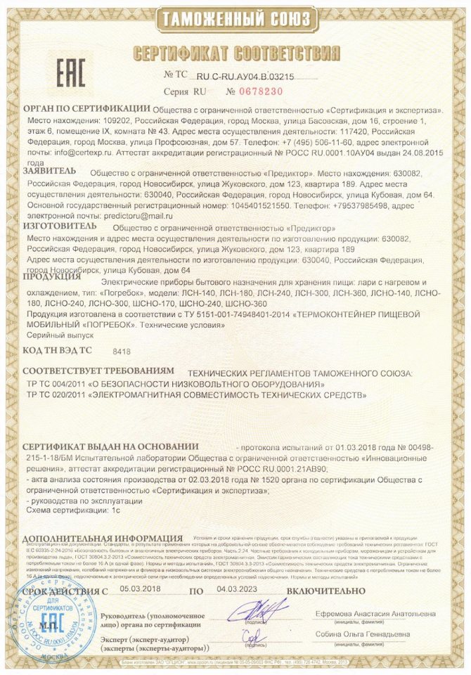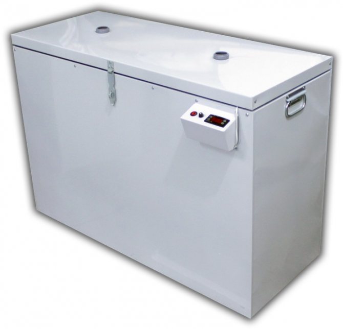 Important! Le maintien de la température optimale pour la sécurité des produits est réalisé au moyen d'un câble en fil souple et d'un thermostat numérique. Conformément au principe de fonctionnement du système de thermorégulation, l'accumulation maximale de réserves de puissance se produit jusqu'à ce que la température réglée par l'utilisateur soit atteinte. Après cela, la consommation d'énergie est réduite au minimum, ce qui ne permet pas à la température à l'intérieur du conteneur de descendre en dessous des limites fixées.