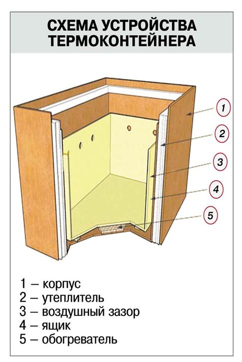 Le conteneur thermique, dont le schéma est présenté ci-dessus, est destiné au stockage des pommes de terre, carottes et autres plantes-racines, le plus souvent stockées pour l'hiver. La température de stockage optimale varie de +2 à +7 degrés, ce qui est presque impossible à obtenir sur un balcon non chauffé dans les conditions des hivers russes. Pour rendre cela possible, ces conteneurs sont équipés de radiateurs de puissance modérée.