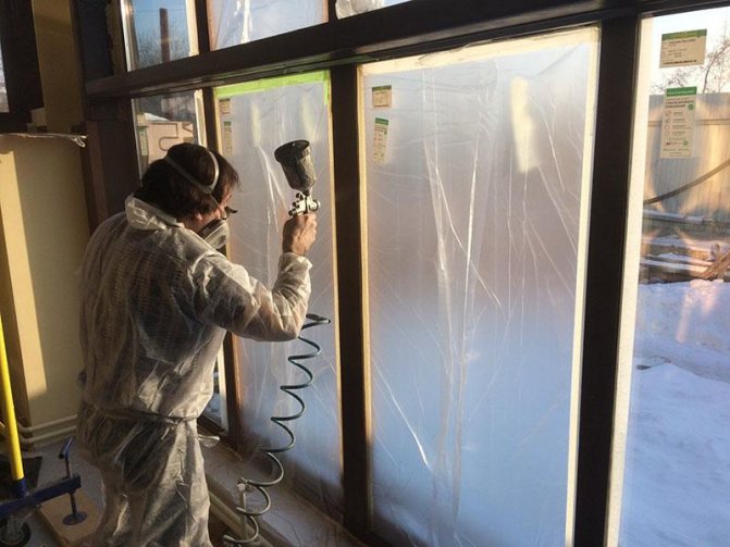 Le revêtement peut être pulvérisé avec de la peinture polyuréthane. Ceci est fait pour créer des cadres bruns qui ressemblent à du bois. Un matériau légèrement différent est utilisé ici, différent des fenêtres en PVC standard. Les cadres de fenêtre peuvent être peints à la maison par d'autres moyens, dont la peinture convient aux fenêtres en PVC, sera décrit ci-dessous.