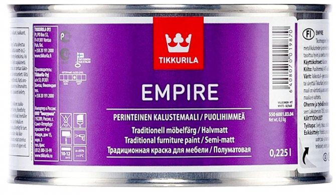 Une bonne option pour peindre les surfaces en bois et en métal. Pas peur de chauffer jusqu'à 100 degrés. Temps de séchage complet - 12 heures. La composition comprend de l'huile siccative à base d'huiles végétales de la plus haute qualité, des charges, des pigments métallisés, divers additifs. Les produits sont prêts à l'emploi immédiatement après un mélange minutieux.