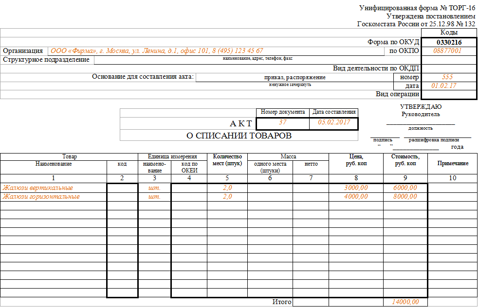 Les stores sont des articles d'inventaire et sont la propriété de l'organisation.Si les biens en raison de la perte de qualité, du mariage, de la rupture ne peuvent pas être utilisés dans l'entreprise, alors pour confirmer le fait de la radiation, un document est rédigé conformément au formulaire établi TORG-16. La radiation pour d'autres motifs est établie sous quelque forme que ce soit, en tenant compte des normes de travail de bureau adoptées dans l'entreprise.