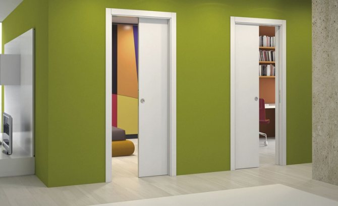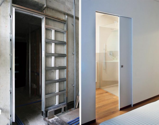 Si l'option de masquage de la structure coulissante dans le mur est plus attrayante, ce mur doit être installé pendant la période de réparation et un guide ou une cassette spéciale contenant la porte doit y être placé. S'il n'est pas possible de construire une nouvelle clôture, il est plus conseillé de placer un mécanisme coulissant à côté du mur ou de fixer un guide et de le sceller avec des feuilles de cloison sèche.