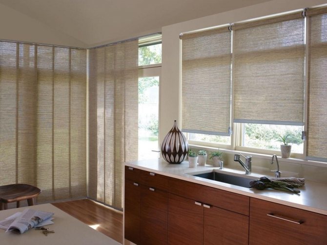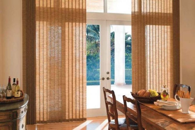 La baie vitrée n'a pas d'exigences de conception particulières. Dans ce cas, vous devez vous fier à l'intérieur de la pièce, ainsi qu'au type de vitrage, qui peut être standard ou panoramique. Si l'ouverture est ouverte et non encombrée de choses, vous pouvez utiliser des structures verticales dans le sol. Pour le vitrage standard, les modèles en bois conviennent, ainsi que les structures romaines et en rouleau.