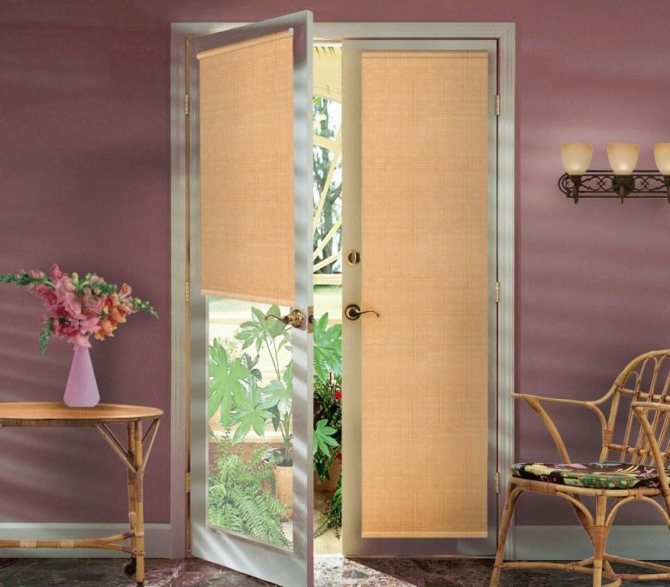 Comme dans le cas des structures de fenêtres, les stores installés dans la porte peuvent être verticaux, horizontaux, sous la forme d'un accordéon ou de volets roulants. De plus, il existe des produits de type chaîne. Ils sont fabriqués à partir de fils et sont utilisés pour protéger les locaux du soleil.