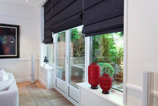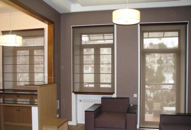 Découvrant la sortie du balcon avec des stores romains, deux toiles sont utilisées - une pour la fenêtre et la seconde pour la porte. L'inconvénient des rideaux romains est qu'ils ne peuvent pas être inclinés sur le côté pour regarder par la fenêtre, et vous pouvez également ouvrir la porte du balcon uniquement après l'assemblage du rideau, sinon cela gênera.