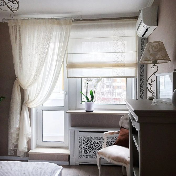 - Complétez les rideaux habituels. Les rideaux enroulables sont souvent utilisés comme un assistant «discret», toute l'attention est portée aux rideaux en tissu;