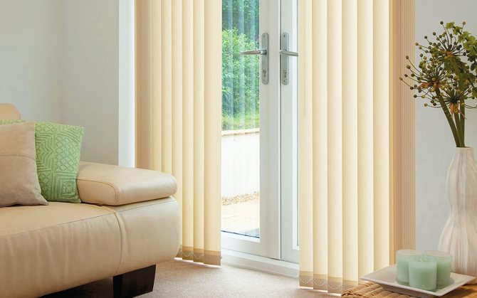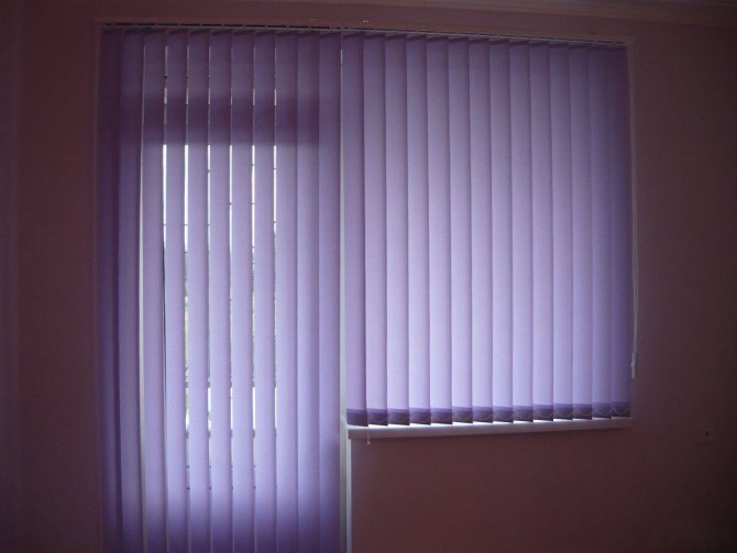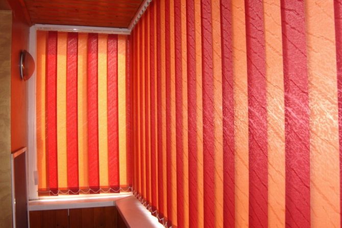 - Vertical - se sont depuis longtemps installés dans les bureaux, mais ont trouvé une application dans les bâtiments résidentiels en raison des variations de couleur, de matériau et de motifs. La structure se compose d'une corniche (plastique ou aluminium), lamelles, poids, patins. Le mécanisme est contrôlé à l'aide d'une chaîne en plastique: les châssis tournent dans des directions différentes et la toile peut être complètement déplacée d'un côté. Pour une ouverture de balcon, une combinaison d'un long vantail pour la porte et d'un court pour la fenêtre est choisie. La corniche est fixée au plafond ou au mur.