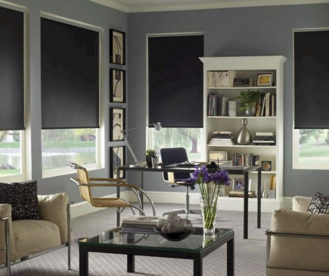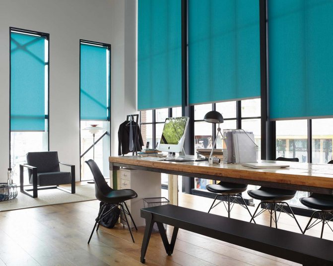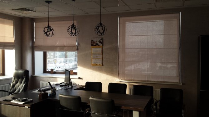 ne doit pas distraire l'attention. Par conséquent, vous devez choisir des filtres de lumière avec un design simple, une couleur unie. Les rideaux pour les studios de création et les salles d'exposition font exception. La praticité est une qualité importante pour le tissu à partir duquel les stores romains de bureau sont fabriqués. Par conséquent, vous devez choisir un matériau avec une imprégnation anti-poussière et anti-salissures ou 100% polyester.