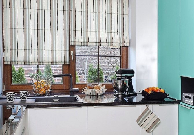il vaut la peine de choisir des rideaux en polyester, lin, coton, fibres mélangées avec des imprégnations qui ont des propriétés anti-poussière et anti-salissures. Il est préférable que le tissu des rideaux de cuisine soit transparent ou translucide, sans motifs larges et lumineux.Les nuances claires et sombres ne conviennent qu'aux cuisines spacieuses.