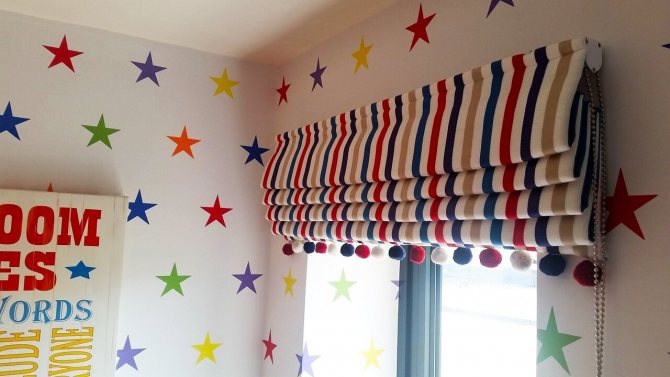 devrait être joyeux, avec une impression intéressante. Mais cette règle s'applique à condition que la décoration soit faite dans des couleurs plus sobres. Un ornement floral ou une bande brillante est une option couramment utilisée. Il ne sera pas superflu de décorer les rideaux romains avec un décor supplémentaire - franges, rubans, glands. Il est préférable d'installer des rideaux motorisés dans la chambre des enfants afin de ne pas attirer l'attention de l'enfant sur les chaînes, les cordes, etc.