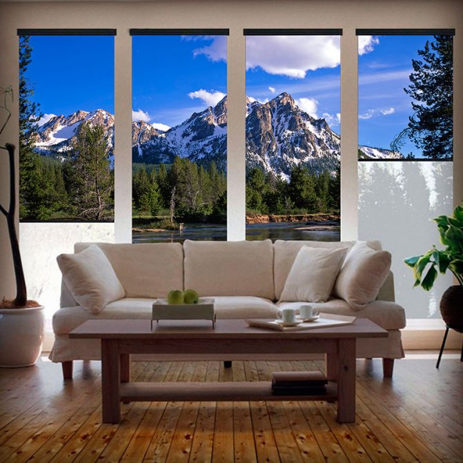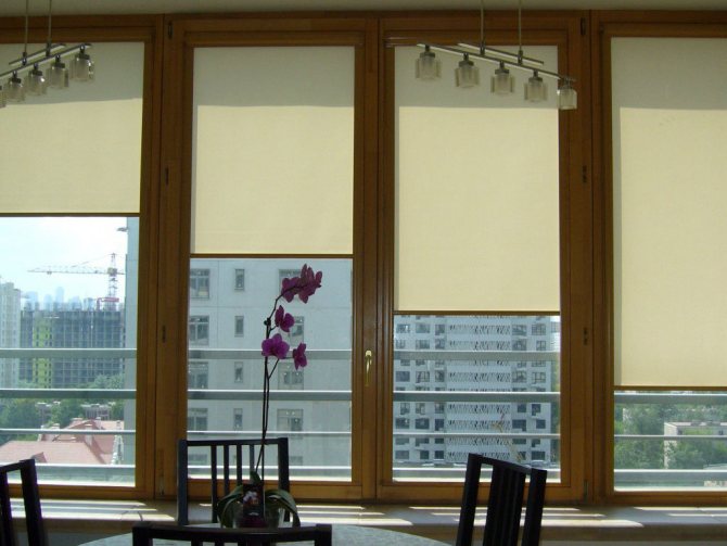 Est une conception complète. Les guides sont situés de telle sorte qu'ils deviennent, pour ainsi dire, une continuation des cadres verticaux. Dans ce cas, le tissu adhère au verre et les stores semblent faire partie intégrante de la fenêtre. - Uni-2