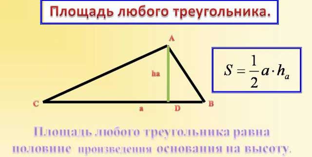 - Triangle. Pour calculer le S d'un triangle, en plus de la valeur de base, vous avez également besoin de la valeur de la hauteur, c'est-à-dire de la perpendiculaire tombée dessus depuis le haut, puis la valeur souhaitée peut être calculée en déterminant la moitié de leur produit.