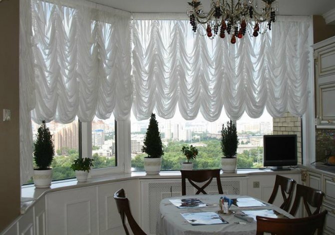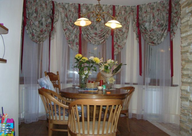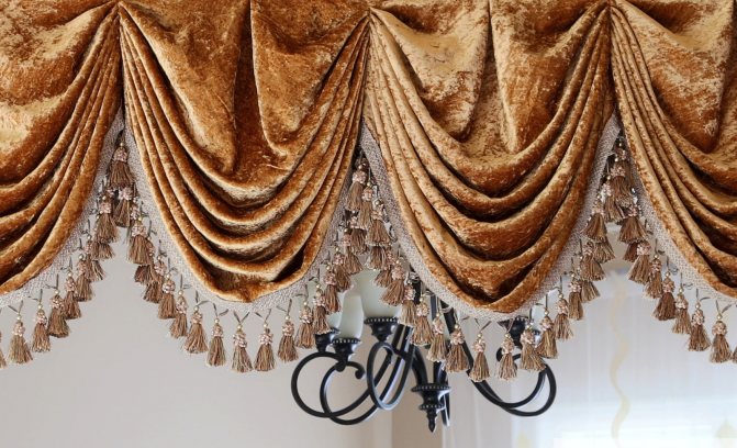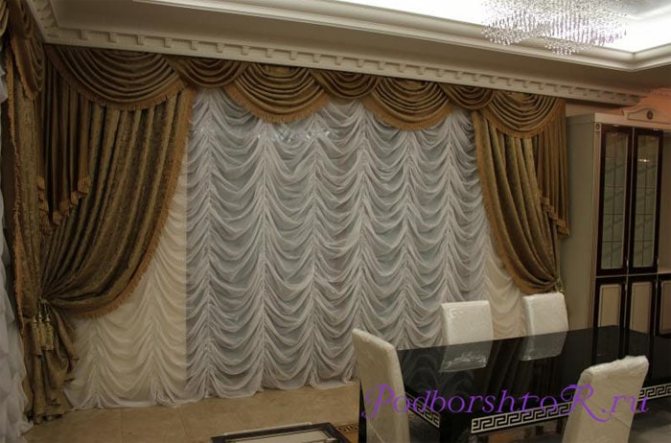 La longueur de l'auvent peut être différente - le rideau ne couvre que l'ouverture de la fenêtre ou descend au sol lui-même. Les rideaux français auront fière allure avec les lambrequins.