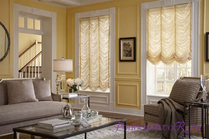Ils sont conçus pour ombrager une pièce. Ils peuvent être soulevés à l'aide d'un mécanisme de levage et fixés avec un loquet. Dans le même temps, les rideaux se rassemblent encore plus en plis luxuriants, suspendus en de beaux "grappes".