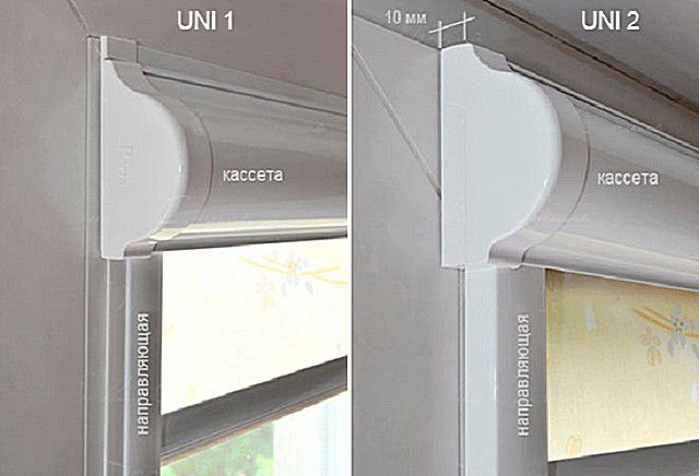 - UNI 1 - ce type de construction est conçu pour les parcloses larges, car les guides pour les rideaux sont fixés à leur partie intérieure, sur tout le périmètre du verre, et la boîte est installée directement sur la bande supérieure du châssis de la fenêtre. Dans ce cas, la toile est aussi proche que possible de la surface du vitrage.