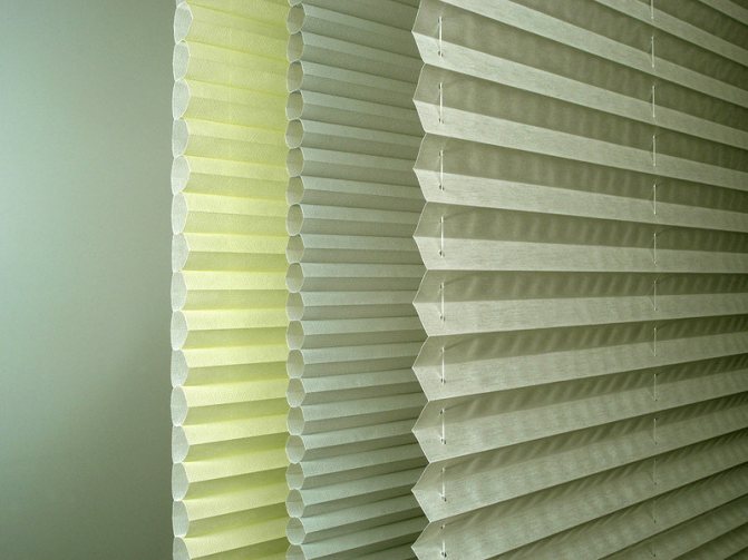 Extérieurement, ils ressemblent à des stores à lamelles horizontales. La seule différence entre les modèles est qu'ils ne sont pas en plastique ou en aluminium, mais en tissu plissé. Lors de la production, de petits plis sont réalisés sur le tissu, qui conservent leur forme pendant longtemps et sont en plastique.