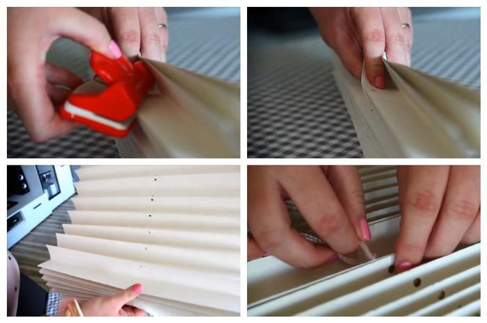 Compressez le papier, appuyez-le contre le bois et percez des trous avec un poinçon à égale distance des deux côtés. Vous devez également faire un trou dans le bloc afin de fixer les filets qui s'étendent dans ces trous sur le dessus.