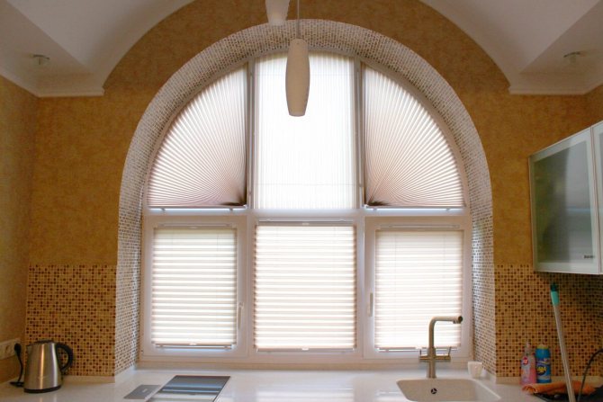 Contrairement aux stores, ils sont constitués de petits fragments, et cette conception vous permet de concevoir des ouvertures de fenêtre même de tailles et de formes non standard, tout en créant des designs inhabituels spectaculaires. L'option la plus courante est un fan de rideaux plissés. De plus, cet élément peut être situé à la fois dans la partie supérieure de l'ouverture de la fenêtre et en bas.
