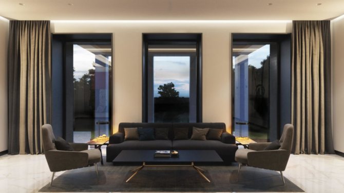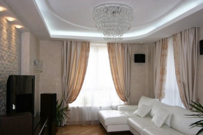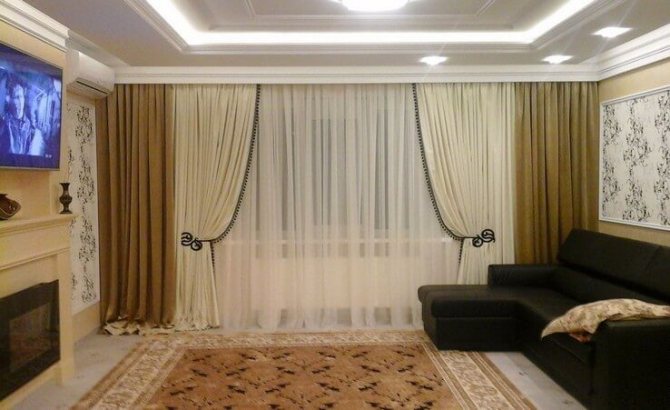 Les combinaisons les plus intéressantes de rideaux pour trois fenêtres dans un salon classique ou néoclassique, art déco ou moderne sont obtenues à l'aide de matériaux contrastés. Par exemple, une combinaison de tulle léger avec du velours, un voile ou une tapisserie.