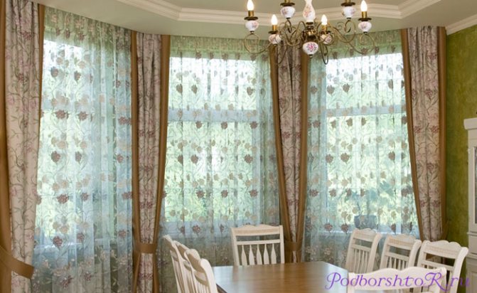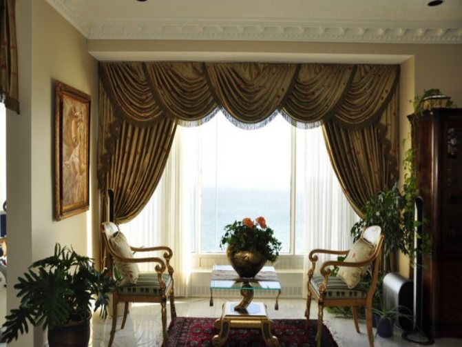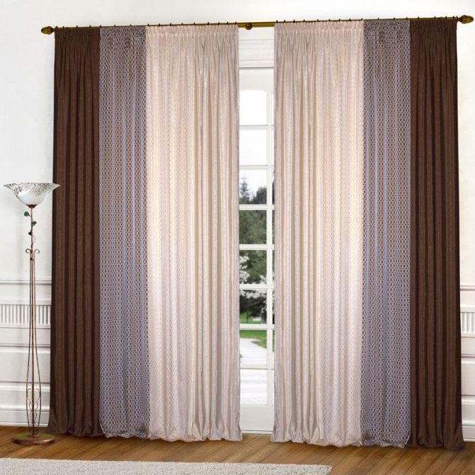 Intéressant! Les rideaux triples conviennent à un design classique, si vous leur ajoutez un lambrequin, divers éléments qui ramassent, pincent et épinglent le tissu.