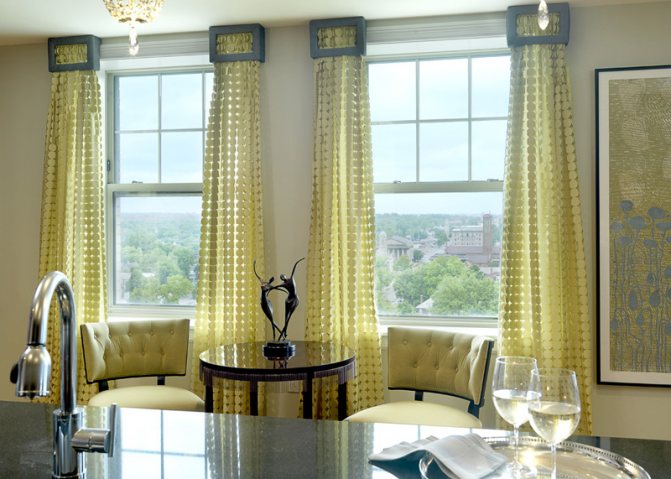 La salle de la cuisine-studio peut être conditionnellement divisée en deux zones: une salle à manger et pour la détente. Le choix des rideaux pour différentes zones est différent: si la lumière est plus importante pour l'espace salle à manger, alors pour le reste - l'apparence.
