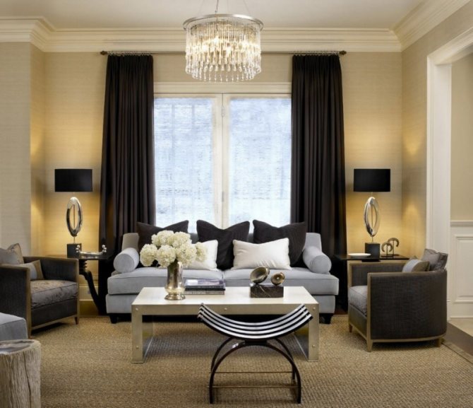 Tout d'abord, vous devez comprendre les caractéristiques de la pièce, car c'est la chose la plus simple à faire. Si les fenêtres font face au sud, les rideaux sont sélectionnés dans des tons froids, s'ils sont au nord - chauds. Les couleurs vives ne sont acceptables que dans une pièce très spacieuse (de 15 à 20 m²). Les plafonds bas auront du mal avec une bande verticale sur les rideaux, si cela est autorisé dans le style.