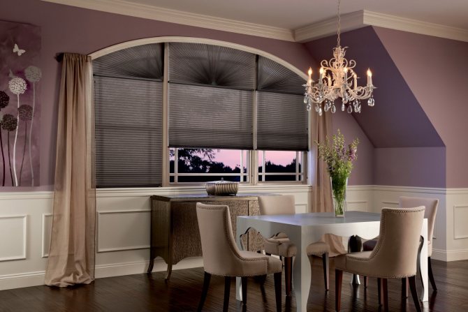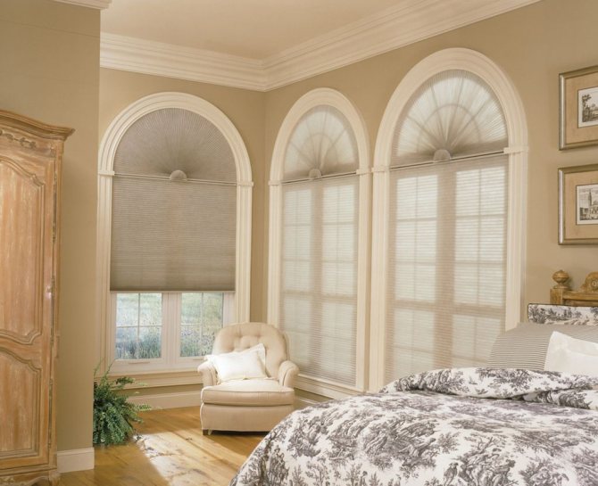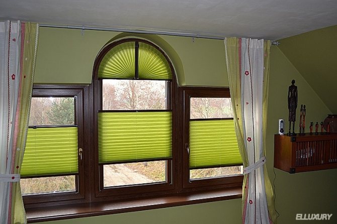 L'option suivante dans la conception des fenêtres cintrées peut être des stores plissés. C'est une excellente solution alternative aux rideaux classiques. Les stores plissés de par leur conception présentent les avantages suivants:
