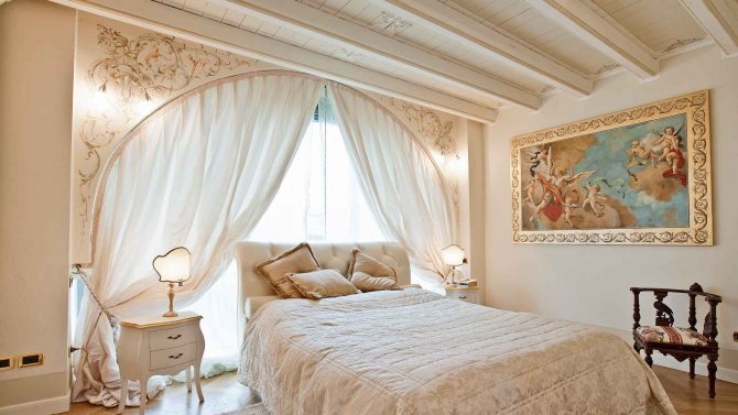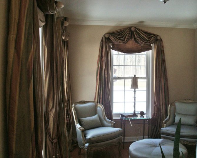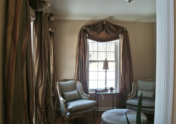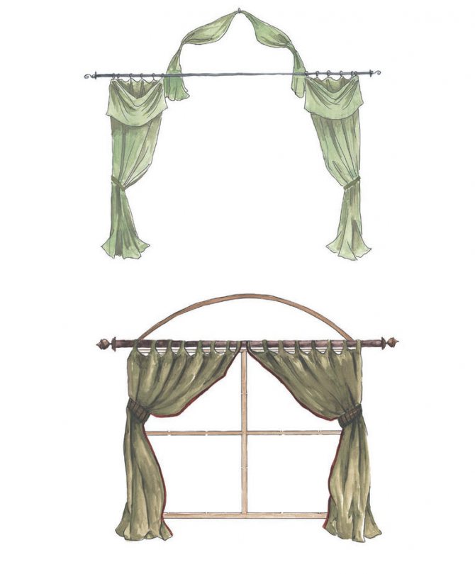 La première option pour attacher des rideaux est sous le coude de l'arc. L'avantage de cet agencement de rideaux est le suivant: