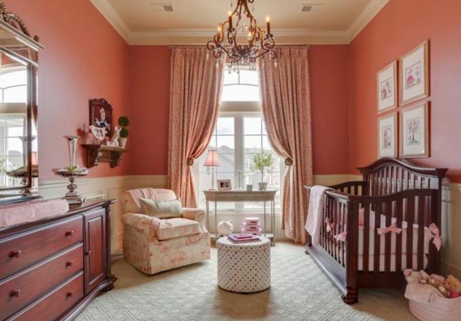Pour la présence constante de la lumière du soleil dans la pépinière, utilisez des rideaux jusqu'au coude cintré en bleu clair ou rose.