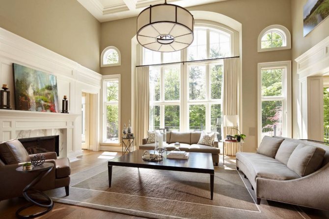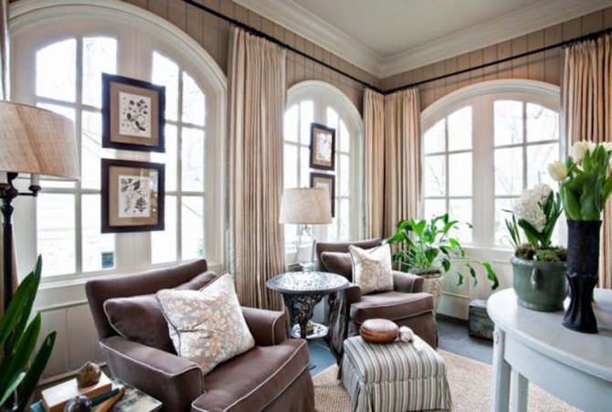 Le hall est le visage de la maison et de ses propriétaires. Cette salle est toujours à la vue des clients. Dans la conception des fenêtres cintrées dans le salon, il est conseillé de souligner leur caractère inhabituel à l'intérieur à l'aide de rideaux correctement sélectionnés.