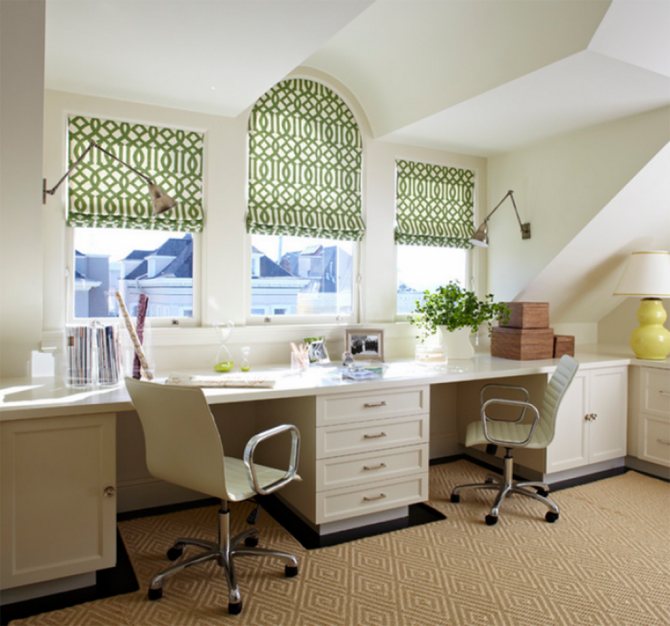 - Bureau et étude. Cela implique un style intérieur strict et professionnel. Pour la décoration des fenêtres cintrées dans le bureau, il est recommandé d'utiliser des stores verticaux ou horizontaux spécialement conçus pour l'ouverture cintrée. Du décor, vous pouvez utiliser des stores romains ou enrouleurs. Les stores plissés ont fière allure. L'essentiel est que la couleur du tissu soit stricte et non flashy. Des volets roulants, il convient de prêter attention au jour et à la nuit et à entraînement électrique. Si vous voulez quelque chose de plus magnifique, vous pouvez prendre des rideaux avec des œillets, des charnières ou des italiens.