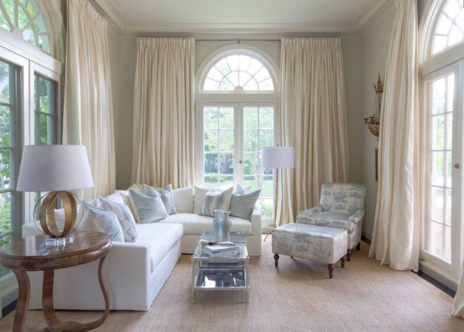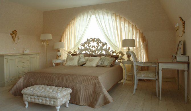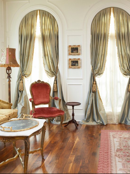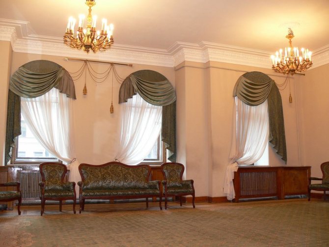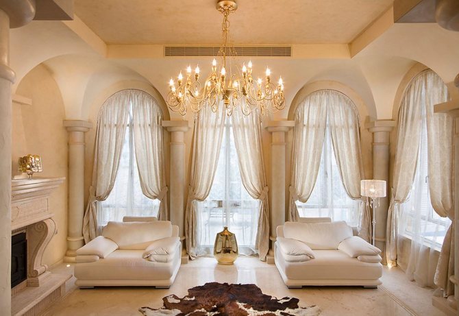 Dans les maisons privées, des locaux publics à des fins de loisirs, de divertissement, des éléments de style classique, rococo et baroque, de style Empire sont introduits à l'intérieur. Conformément aux tendances de la mode, les fenêtres cintrées ont des détails de décoration spécifiques de la marque Foroom. Un détail essentiel est les stores sur les fenêtres cintrées de différents modèles: