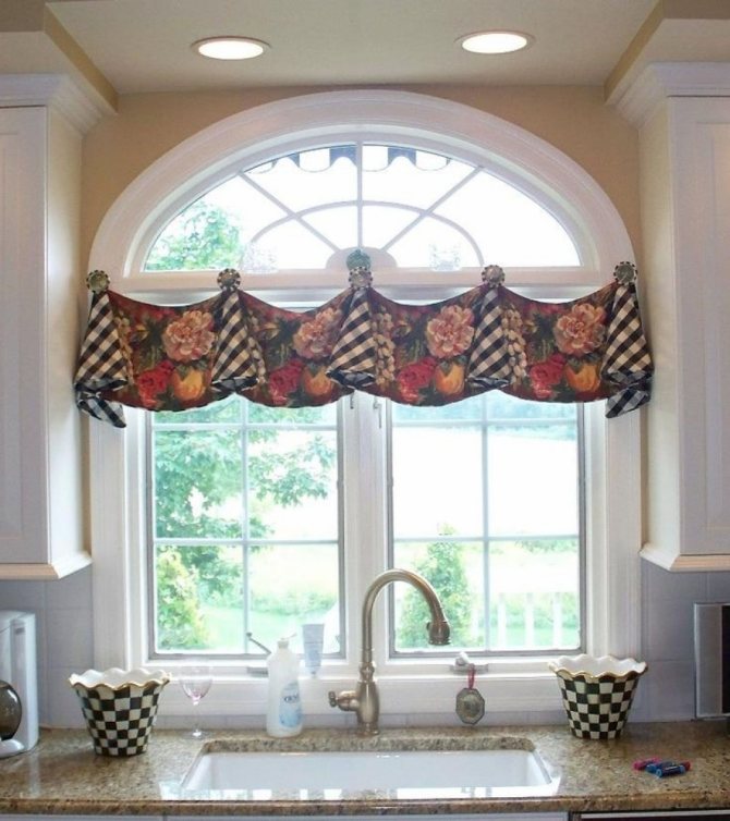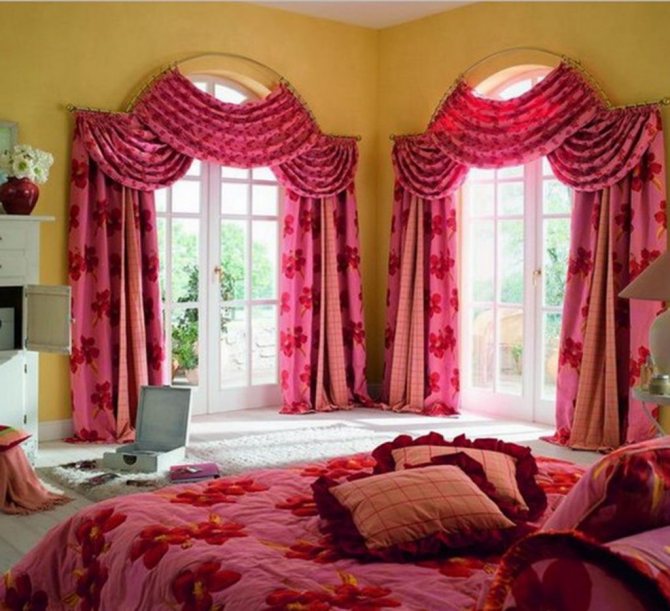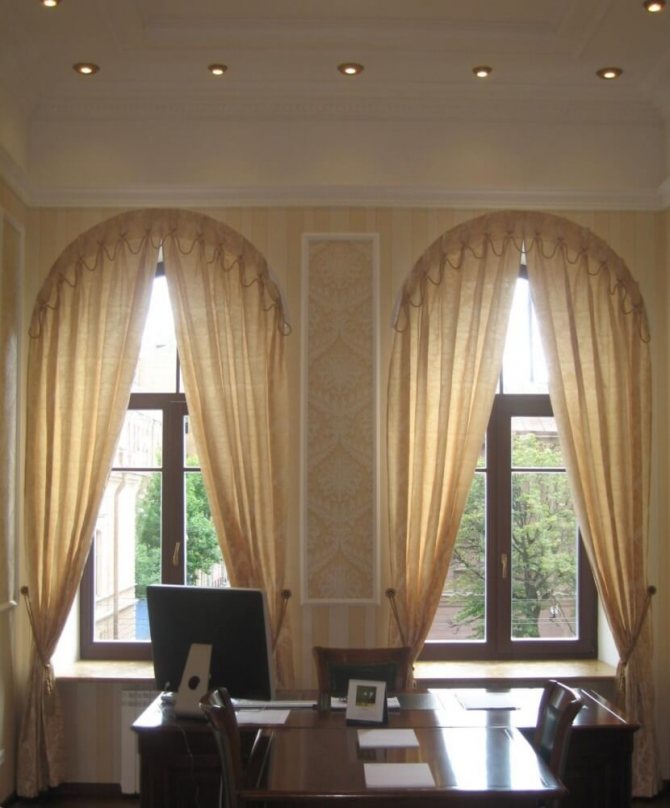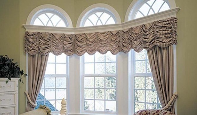 Il n'y a aucune restriction ici. Les «manches d'évêque» laconiques en combinaison avec du tulle, des rideaux autrichiens luxueux, des vagues françaises translucides, des plis romains stricts, des rideaux multicouches, divers lambrequins, cravates, butins, chaînes et nœuds sont également avantageux sur les fenêtres sous la forme d'un arc.