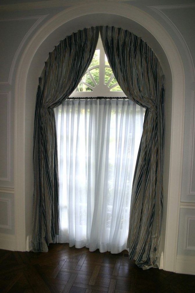 Une bonne solution serait d'utiliser une corniche incurvée le long de l'arc ou des attaches le long de son rayon. Les rideaux peuvent être décorés avec des draperies et des embrasses supplémentaires.
